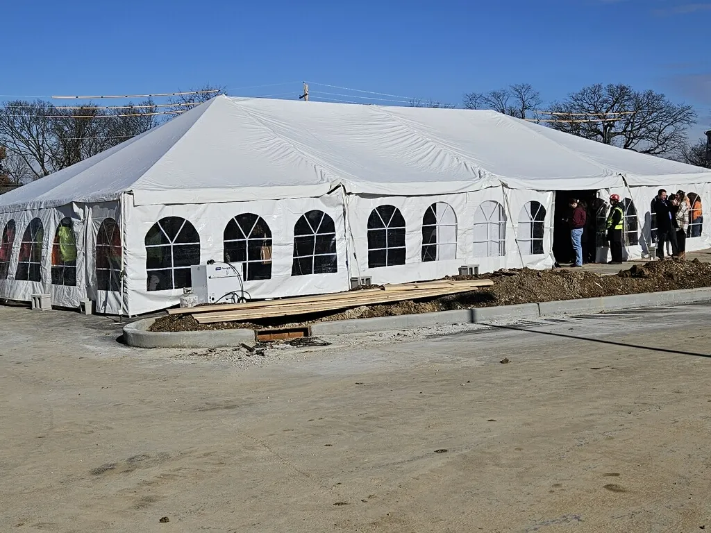 We were contracted to execute an event in Webster Groves to and provide Tenting, Staging, Chairs, Tables, Heaters to support over 220 guests as the hospital beam placement was observed and celebrated.