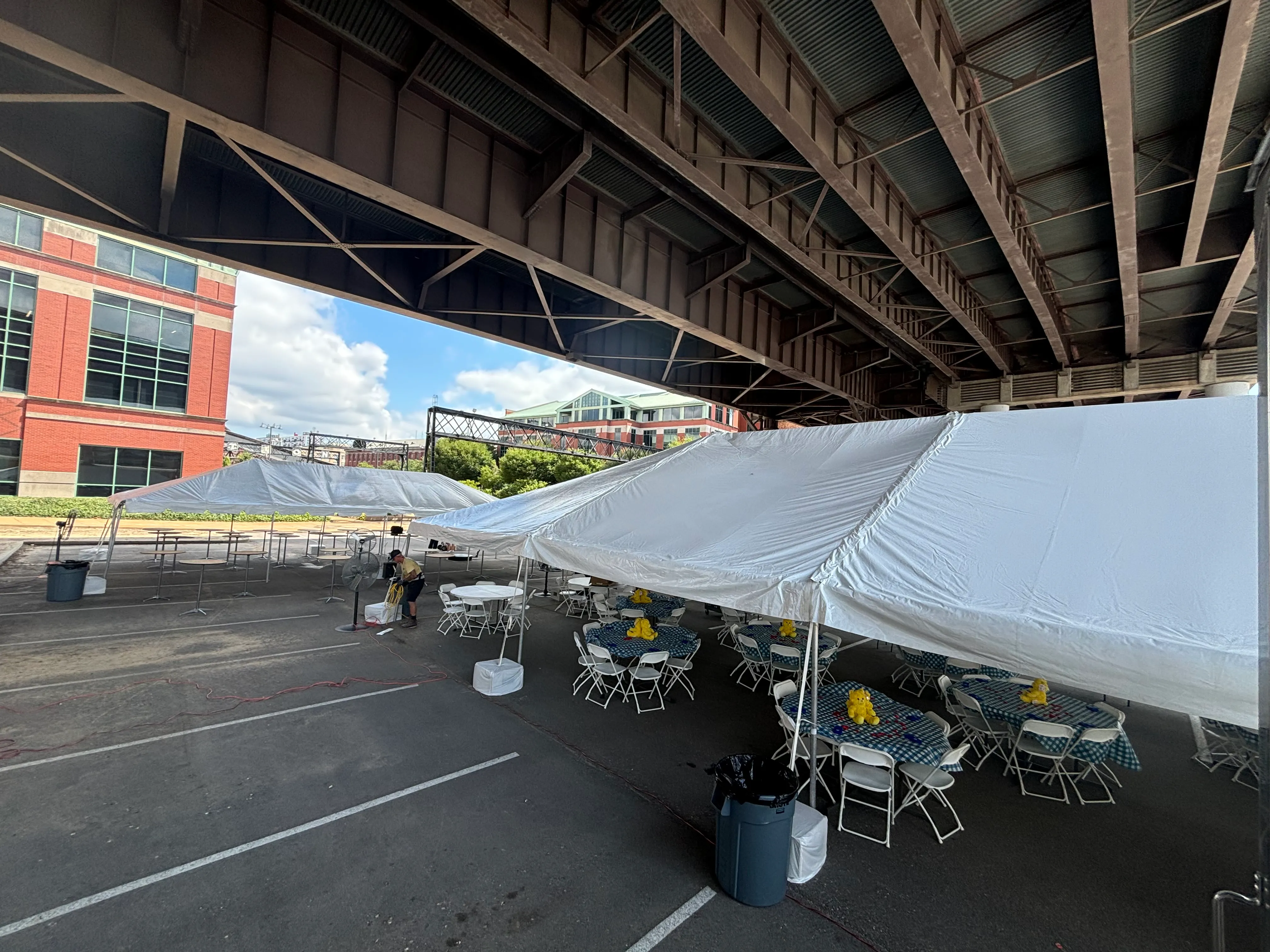 Build-A-Bear had a large outdoor event in the parking lot of their downtown headquarters, and we were contracted to provide layouts and execute tenting, tables, chairs, cocktail tables, fans, and PA Speakers/Microphone for their event.